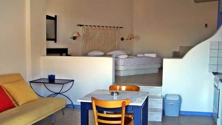 Die Studios und Zimmer des Apollon Village Hotels sind mit Fliesenböden, weiß getünchten Wänden und einem möblierten Balkon ausgestattet. Zu den Annehmlichkeiten zählen ein Kühlschrank, ein Wasserkocher und ein Telefon. Jedes Zimmer verfügt über ein eigenes Bad mit Dusche und Haartrockner, einige Unterkünfte sind zusätzlich mit einer Whirlpool-Badewanne ausgestattet.