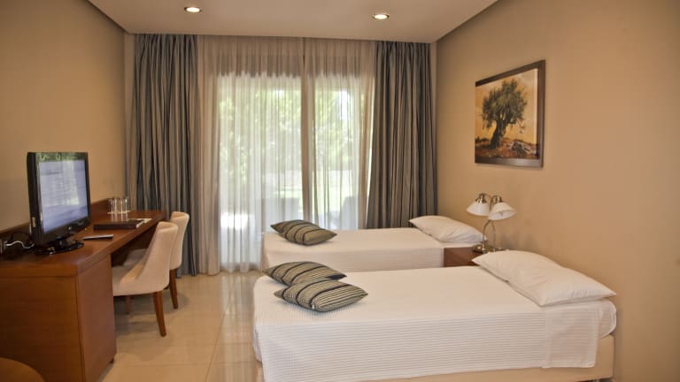 Die Zimmer sind mit Klimaanlage und Heizung ausgestattet, verfügen über einen Balkon oder eine Terrasse mit Gartenblick und bieten ein Queensizebett sowie ein Sofabett. Weitere Annehmlichkeiten sind ein Safe, eine Minibar, ein Kühlschrank, eine Tee-/Kaffeemaschine, ein Bügelset, ein TV-Gerät und WLAN. Die Badezimmer sind mit Dusche, Badewanne und Whirlwanne ausgestattet und bieten Pflegeprodukte sowie Haartrockner und Bademäntel. Zudem sind rollstuhlgerechte und Nichtraucherzimmer verfügbar.