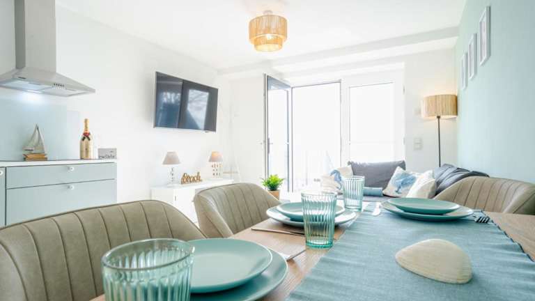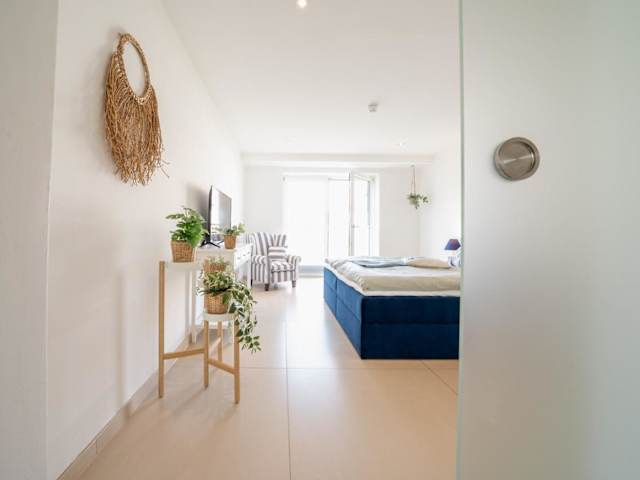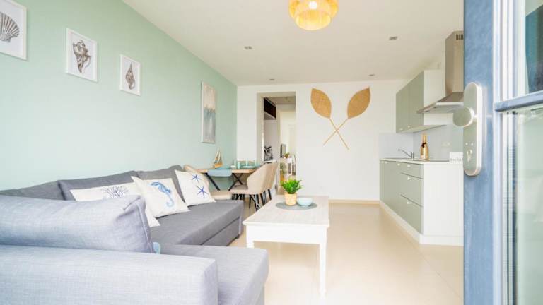 Die Ferienwohnung verfügt über ein Schlafzimmer, ein Wohnzimmer und eine Terrasse mit Meerblick. Zur Ausstattung gehören ein Flachbild-TV, eine gut ausgestattete Küche mit Kühlschrank und Geschirrspüler sowie ein Badezimmer mit Dusche.