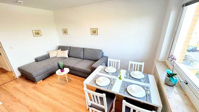 Die Unterkunft umfasst ein Schlafzimmer, ein Wohnzimmer mit TV, eine voll ausgestattete Küche (inklusive Kühlschrank und Geschirrspüler) sowie ein Badezimmer mit Dusche. Handtücher und Bettwäsche werden zur Verfügung gestellt.