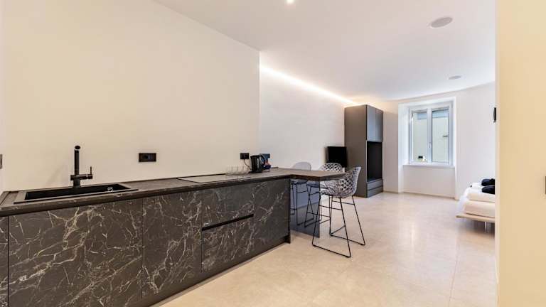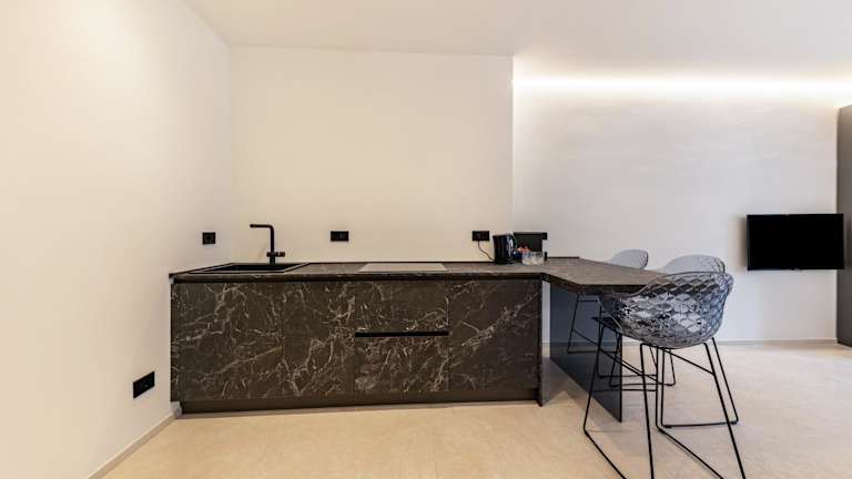 Die Ferienwohnung ist mit einer voll ausgestatteten Küche ausgestattet, die einen Kühlschrank und eine Kaffeemaschine umfasst.