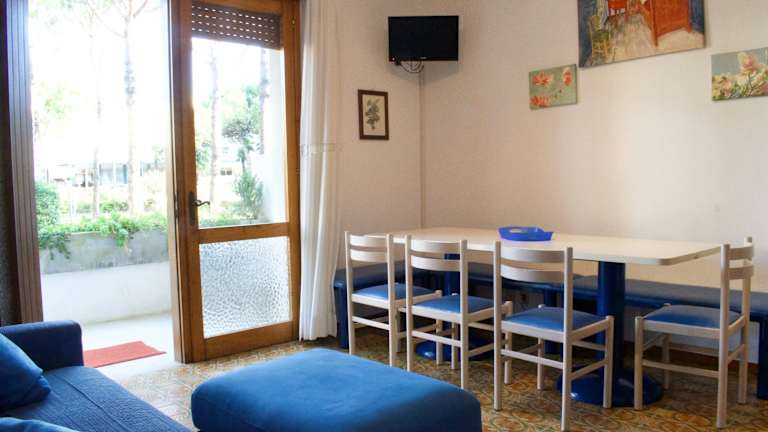 Die Wohnung bietet zwei Schlafzimmer, ein Wohnzimmer und ein Badezimmer mit Bidet. Zur Ausstattung gehören ein Flachbild-TV, eine gut ausgestattete Küche mit Kühlschrank und Ofen sowie eine Terrasse mit Gartenblick. Handtücher und Bettwäsche sind nicht im Preis enthalten, können jedoch gegen eine Gebühr von 25 EUR pro Person ausgeliehen werden.