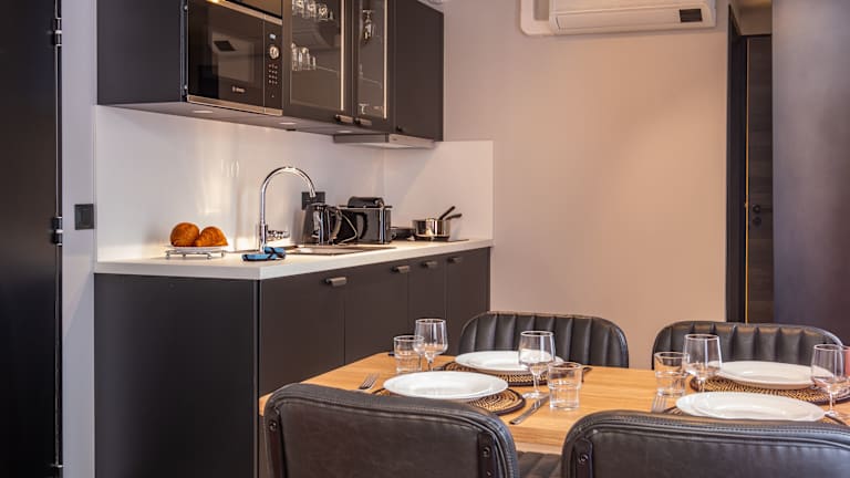 Die Zimmer sind mit einer Klimaanlage ausgestattet und verfügen über eine voll ausgestattete Küche mit einem Essbereich. Zur Ausstattung gehören ein Flachbild-TV sowie ein eigenes Badezimmer mit Dusche, kostenlosen Pflegeprodukten und einem Haartrockner. Des Weiteren sind ein Kühlschrank, Geschirrspüler, Ofen, Kaffeemaschine und Wasserkocher vorhanden. Den Gästen steht kostenloses WLAN zur Verfügung.