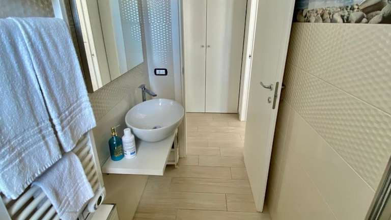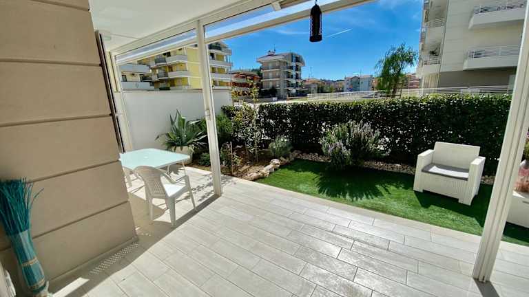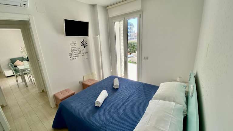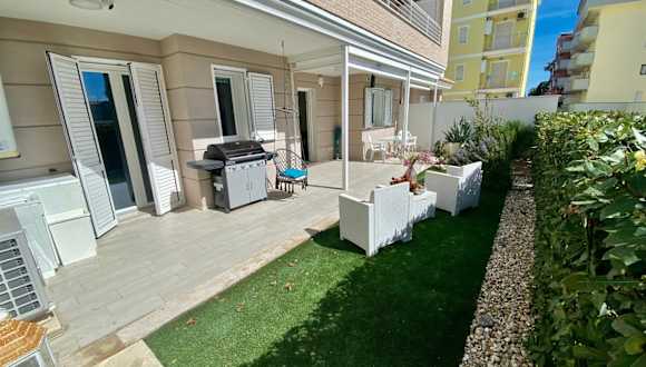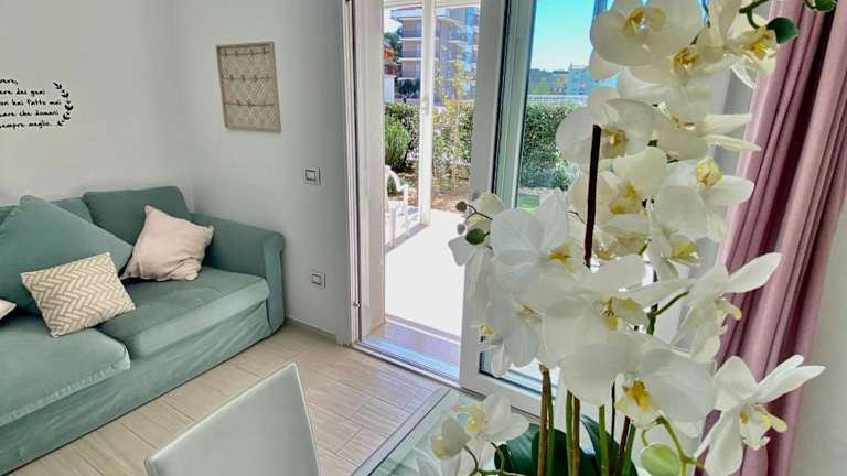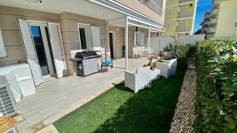 Appartamento al mare con giardino, spiaggia e piscina bietet Übernachtungsmöglichkeiten in einer klimatisierten Ferienwohnung mit eigenem Strandbereich, einem saisonalen Außenpool und einem Garten. Zudem stehen den Gästen kostenlos nutzbare Fahrräder zur Verfügung.