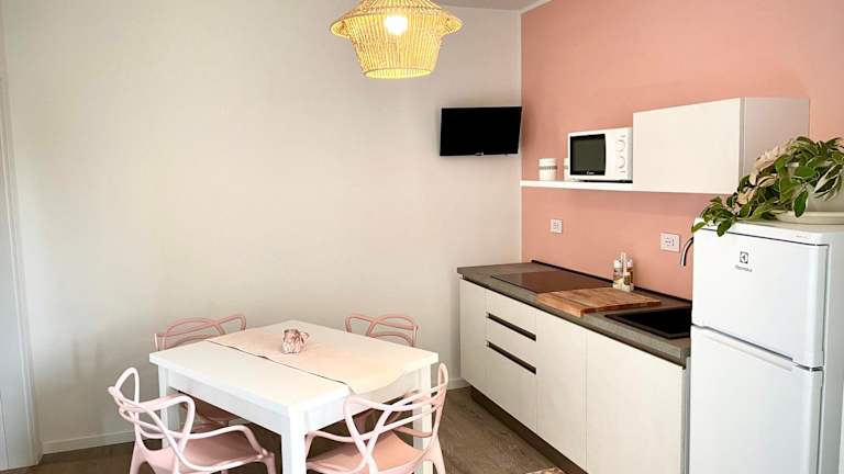 Das Appartamento Rosa ist eine Unterkunft, die Übernachtungsmöglichkeiten in Form einer Ferienwohnung bietet. Sie verfügt über eine Terrasse, kostenlosen WLAN-Zugang sowie Zugang zu einem Balkon. Die Wohnung ist klimatisiert und umfasst einen separaten Schlafbereich sowie ein Wohnzimmer.