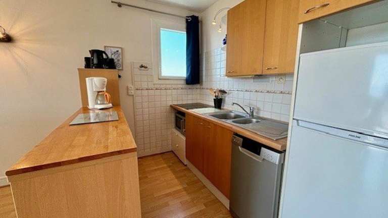 Die Ferienwohnung bietet eine gut ausgestattete Küche mit Kühlschrank und Geschirrspüler für die Selbstverpflegung.