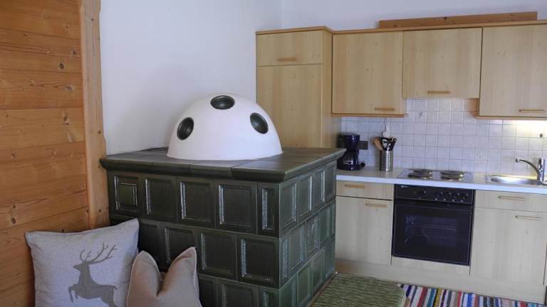Die Ferienwohnung ist mit einer voll ausgestatteten Küche ausgestattet. Diese umfasst einen Kühlschrank, einen Geschirrspüler, einen Ofen sowie eine Kaffeemaschine und einen Wasserkocher.