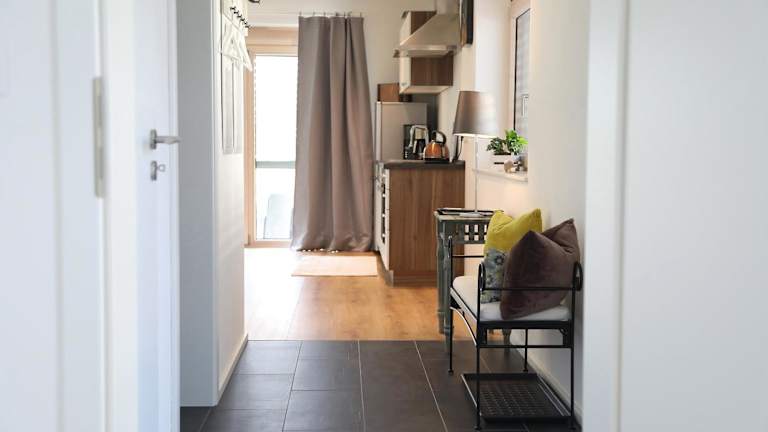 Das Appartement verfügt über 1 Schlafzimmer und ein Wohnzimmer sowie eine gut ausgestattete Küche mit Kühlschrank und Geschirrspüler. Zur weiteren Ausstattung gehören ein TV, ein Badezimmer mit Dusche, Handtücher und Bettwäsche. Die Terrasse bietet einen schönen Stadtblick.