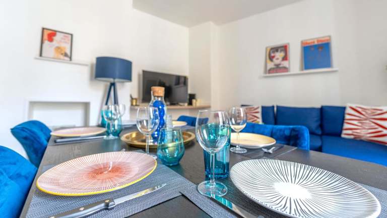 Die Unterkunft beinhaltet eine voll ausgestattete Küche mit Kühlschrank, Geschirrspüler und Ofen. Zudem stehen ein Essbereich und ein Wohnzimmer zur Verfügung, um die Gäste bei der Selbstverpflegung zu unterstützen.