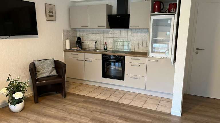 Die Ferienwohnung ist mit einem Schlafzimmer und einem Badezimmer ausgestattet. Zur Ausstattung gehören Bettwäsche, Handtücher, ein Flachbild-TV mit Satellitenkanälen sowie ein Essbereich. Die voll ausgestattete Küche bietet die Möglichkeit zur Selbstverpflegung. Zudem verfügt die Unterkunft über eine Terrasse mit Gartenblick.
