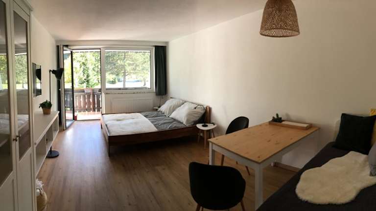 Die Ferienwohnung hat ein Schlafzimmer und ein Badezimmer. Zur Ausstattung gehören Bettwäsche, Handtücher, ein Flachbild-TV mit Kabelkanälen, ein Essbereich, eine voll ausgestattete Küche sowie eine Terrasse mit Blick auf die Berge.