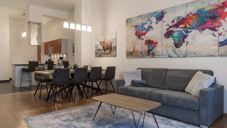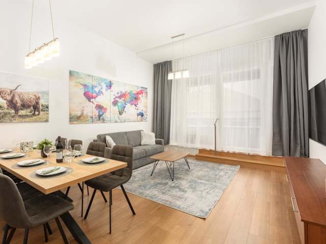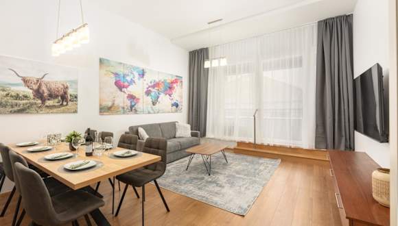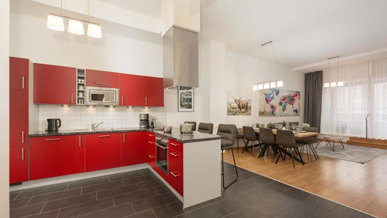 Die Ferienwohnung umfasst drei Schlafzimmer, ein Wohnzimmer und zwei Badezimmer mit Dusche. Zu den weiteren Ausstattungsmerkmalen zählen ein Flachbild-TV sowie eine gut ausgestattete Küche mit Kühlschrank und Geschirrspüler. Bettwäsche und Handtücher können gegen Aufpreis zur Verfügung gestellt werden.