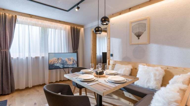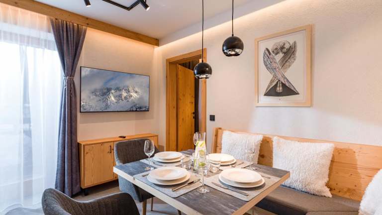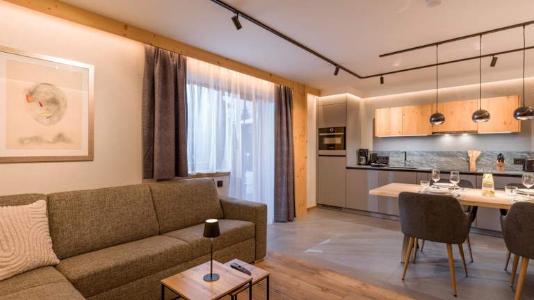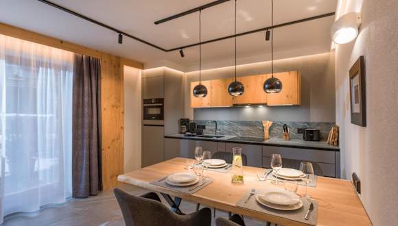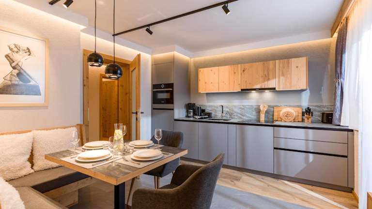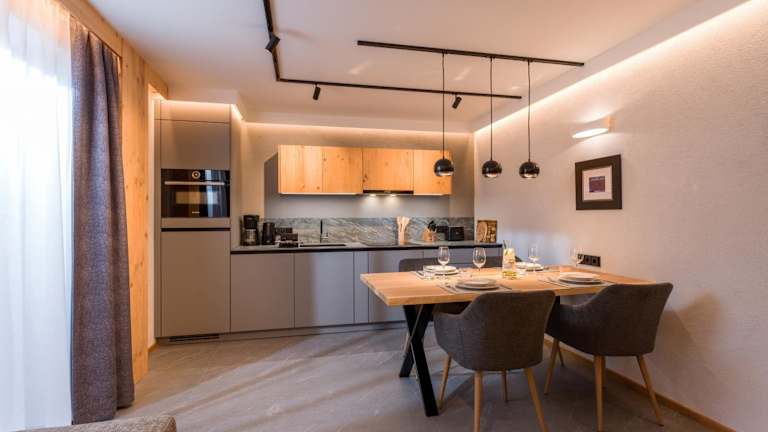 Die Wohneinheiten sind mit einer voll ausgestatteten Küche ausgestattet, die einen Kühlschrank, einen Geschirrspüler, einen Ofen, eine Mikrowelle, eine Kaffeemaschine und einen Wasserkocher umfasst. Ein Essbereich ist ebenfalls vorhanden.