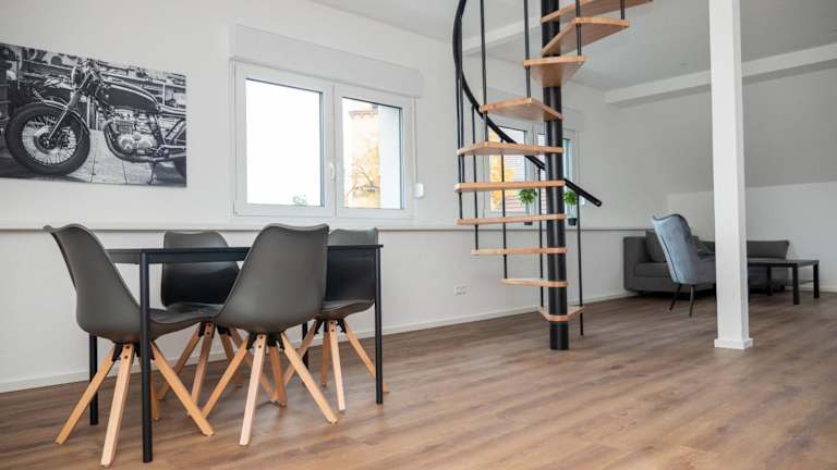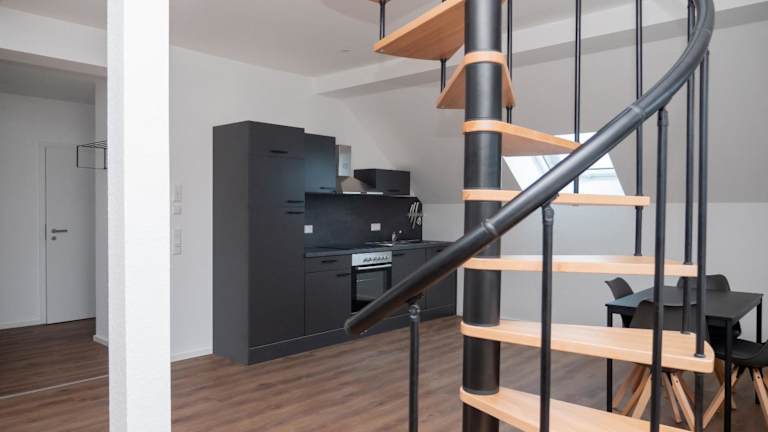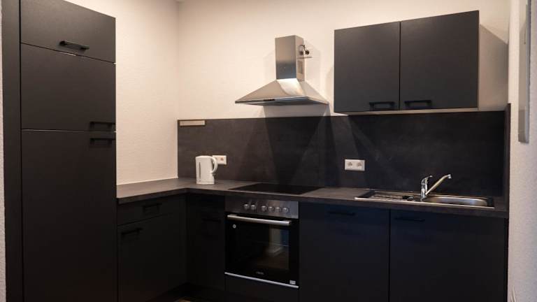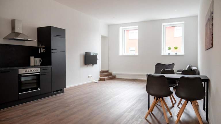 Die Wohneinheiten verfügen über eine voll ausgestattete Küche, die diverse Kochmöglichkeiten bietet, darunter einen Kühlschrank, Geschirrspüler und Ofen. Ein separater Essbereich ist ebenfalls vorhanden.