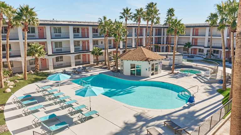 Das Aqua Soleil Hotel and Mineral Water Spa befindet sich in Desert Hot Springs, Kalifornien, etwa 16,1 km von der Innenstadt von Palm Springs und 53 km vom Joshua-Tree-Nationalpark entfernt. Der Flughafen Palm Springs International ist nach 20 Fahrminuten erreichbar.