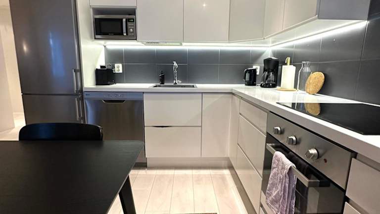 Die Unterkunft verfügt über eine voll ausgestattete Küche, die mit einem Kühlschrank, Geschirrspüler, Ofen, Mikrowelle, Herdplatte, Kaffeemaschine und Wasserkocher ausgestattet ist.