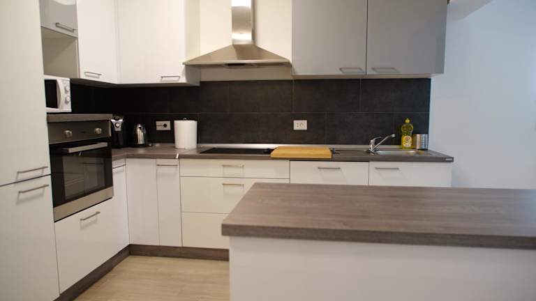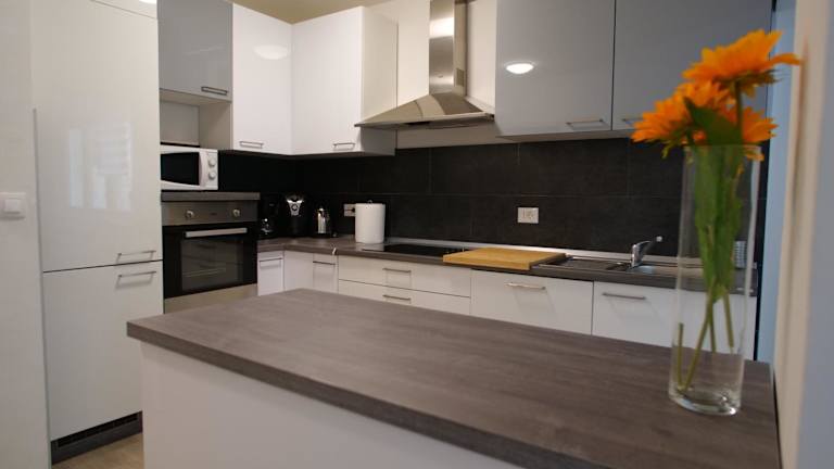 Die gut ausgestattete Küche umfasst einen Kühlschrank und einen Geschirrspüler. Haushaltsannehmlichkeiten wie ein Ofen und ein Wasserkocher stehen ebenfalls zur Verfügung.