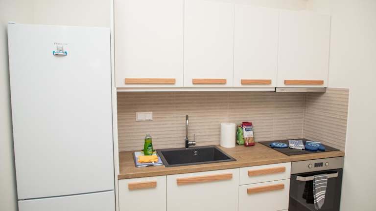 Die Ferienwohnung ist mit einer voll ausgestatteten Küche ausgestattet, die einen Kühlschrank und einen Wasserkocher umfasst. Es sind keine Informationen über weitere Verpflegungsmöglichkeiten vorhanden.