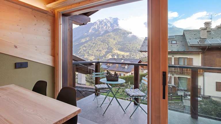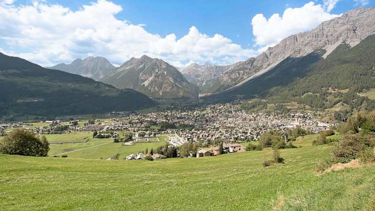 Valdisotto, 38 km entfernt vom Benediktinerinnenkloster St. Johann, mit Blick auf die Berge.