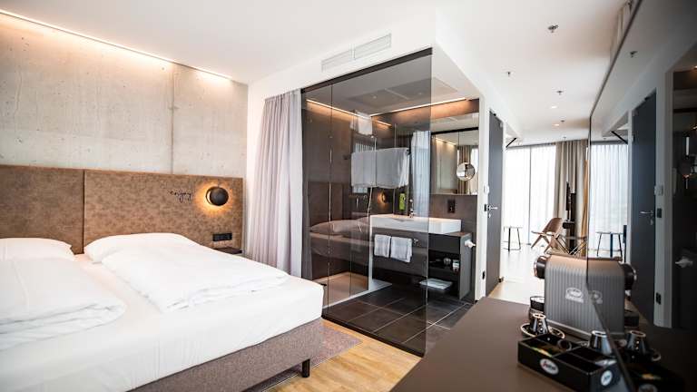 Die Zimmer im arte Hotel Salzburg sind klimatisiert und verfügen über ein eigenes Bad mit Dusche. Zur Ausstattung gehören ein Schreibtisch, ein Flachbild-TV, ein Safe, eine Minibar und ein Kleiderschrank. Einige Zimmer bieten zusätzlich einen Sitzbereich und Bergblick. Die Unterbringung bietet auch rollstuhlgerechte Zimmer sowie Nichtraucherzimmer an. Badezimmerausstattung umfasst einen Haartrockner und einen Kosmetikspiegel.