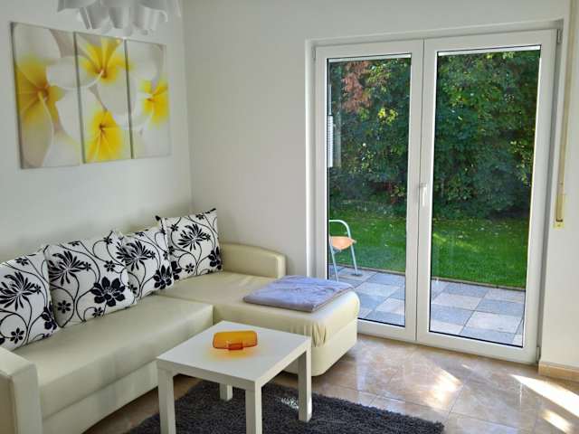 Die Ferienwohnung besteht aus einem Schlafzimmer und einem Badezimmer. Zur Ausstattung gehören Bettwäsche, Handtücher, ein Flachbild-TV mit Satellitenkanälen und eine Terrasse mit Gartenblick. Zusätzlich ist die Unterkunft mit Gartenmöbeln und einer voll ausgestatteten Küche ausgestattet.