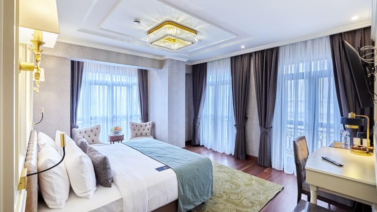 Die Zimmer im Aspera Hotel Golden Horn sind mit Klimaanlage, Heizung und einem Flachbild-TV ausgestattet. Einige Zimmer verfügen über einen Balkon und Meerblick. Zur Standardausstattung gehören ein Schreibtisch, eine Minibar, ein Safe und eine Tee-/Kaffeemaschine. Die Badezimmer sind mit einer Dusche und einer Badewanne sowie Haarföhn und Kosmetikartikeln ausgestattet. Zu den Annehmlichkeiten zählen Hausschuhe und kostenloses WLAN.