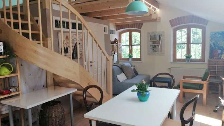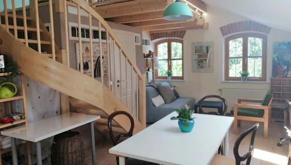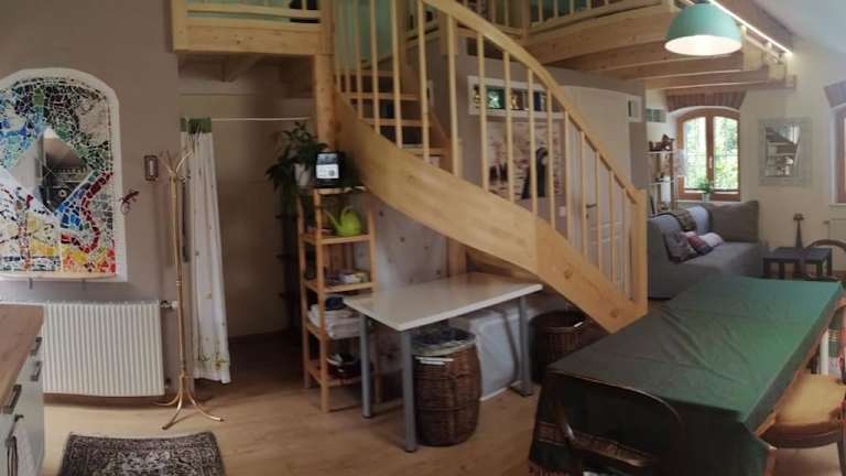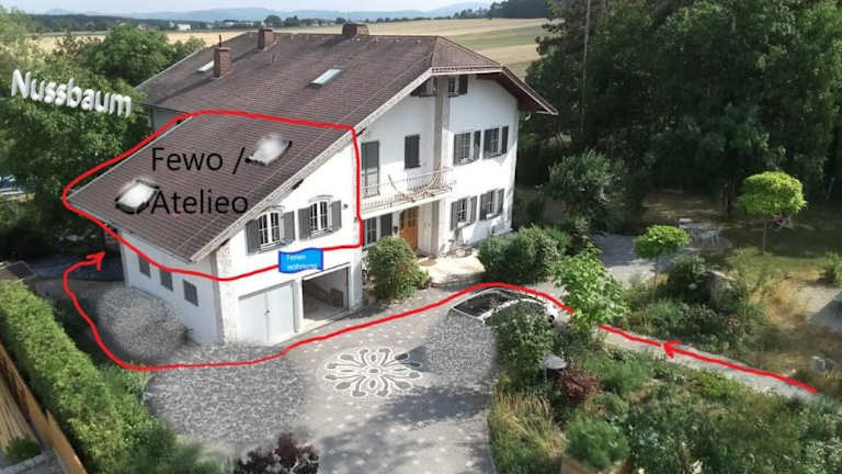 Atelieo beim Nussbaum bietet Übernachtungsmöglichkeiten mit Gartenblick und einem Balkon. Die Ferienwohnung ist ausgestattet mit einem eigenen Pool und bietet eine ruhige Atmosphäre in der Natur.
