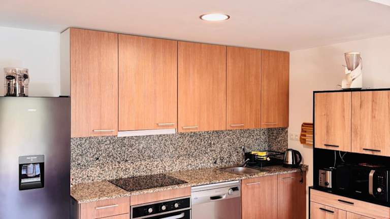 Die Ferienwohnung verfügt über zwei Schlafzimmer, ein Wohnzimmer sowie eine voll ausgestattete Küche mit Kühlschrank und Wasserkocher. Zudem sind zwei Badezimmer mit Dusche und Haartrockner vorhanden. In der Unterkunft werden Handtücher und Bettwäsche bereitgestellt. Die Unterkunft bietet Platz für Familien und ist mit Heizung und Klimaanlage ausgestattet.