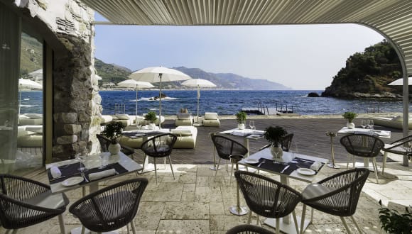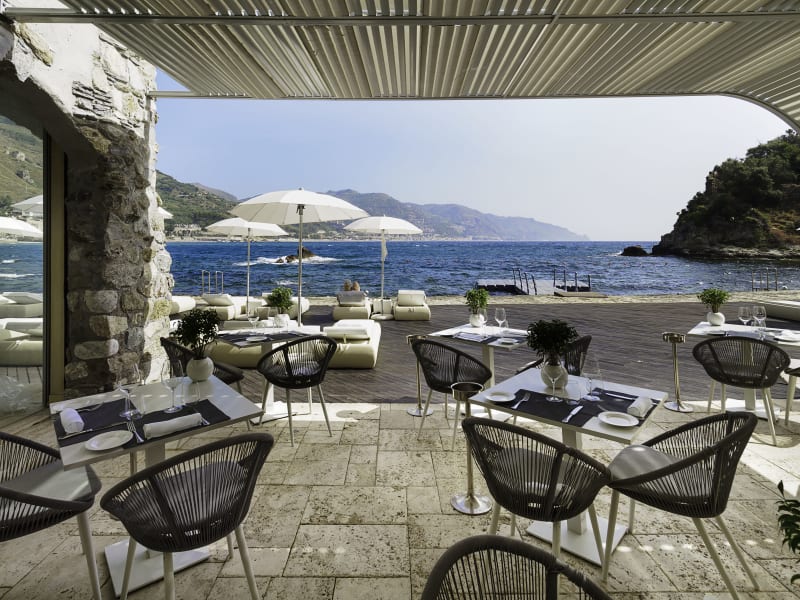 Das Hotel Atlantis Bay - VRetreats in Taormina bietet seinen Gästen einen einzigartigen Aufenthalt in einer atemberaubenden Lage an der Bucht Baia delle Sirene. Das Hotel erstreckt sich terrassenförmig über Felsen bis zum Meer und bietet eine Vielzahl an Annehmlichkeiten. Besonders hervorzuheben ist das Panoramarestaurant mit Veranda, das einen spektakulären Blick auf das Meer bietet. Hier können Gäste auch direkt am Meer speisen. Der Pool und die eigene schwimmende Plattform laden zum Entspannen und Genießen ein. Das Hotel Atlantis Bay legt großen Wert auf exzellenten Service und bietet seinen Gästen sizilianisch-herzliche Gastfreundschaft.