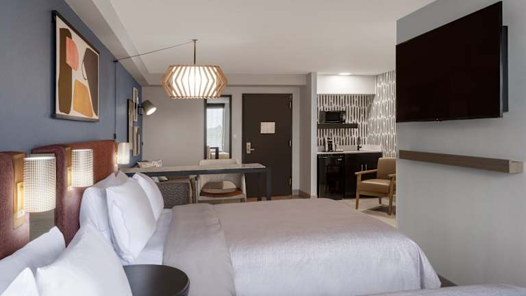 Die Zimmer sind mit einem Queensizebett, einem Sofabett, Klimaanlage und Heizung ausgestattet. Sie verfügen zudem über eine Kochnische mit Kühlschrank, Mikrowelle und Kaffee-/Teekocher. Weitere Annehmlichkeiten sind ein Schreibtisch, TV, CD- und DVD-Player sowie kostenloses WLAN. Im Badezimmer gibt es eine Dusche, Haartrockner, Kosmetikartikel und eine Auswahl an Handtüchern. Es sind auch rollstuhlgerechte Zimmer verfügbar.