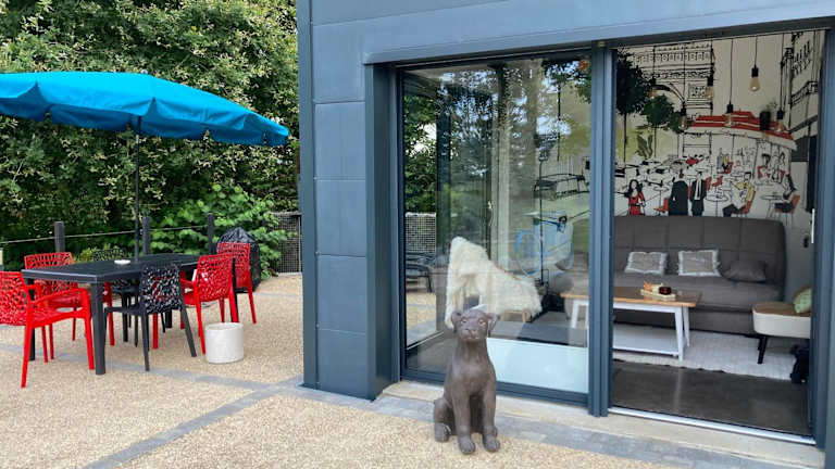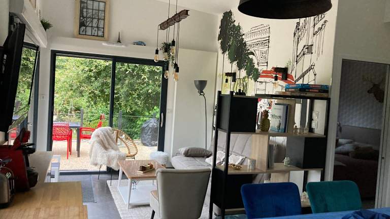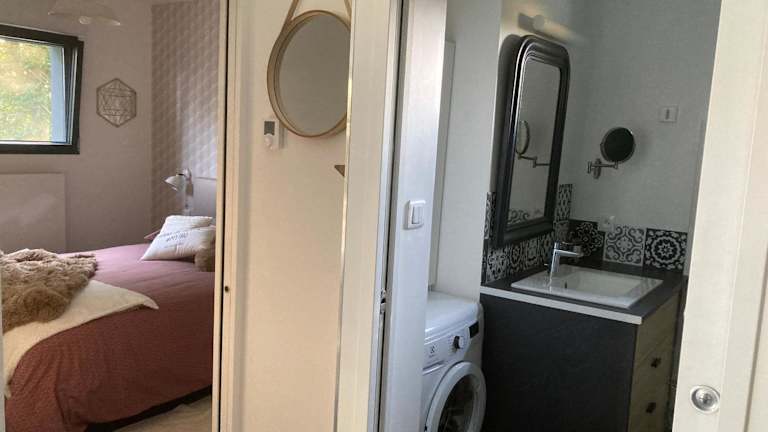 Die Ferienwohnung umfasst ein Schlafzimmer, ein Wohnzimmer, ein Badezimmer mit Dusche sowie eine gut ausgestattete Küche mit Kühlschrank und Geschirrspüler. Handtücher und Bettwäsche werden bereitgestellt. Die Unterkunft bietet außerdem eine Terrasse mit Blick auf den Garten.