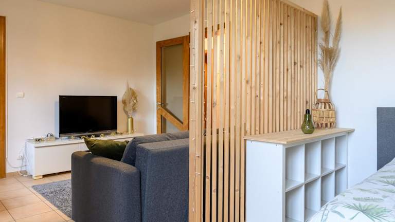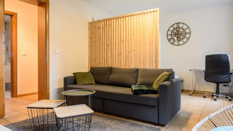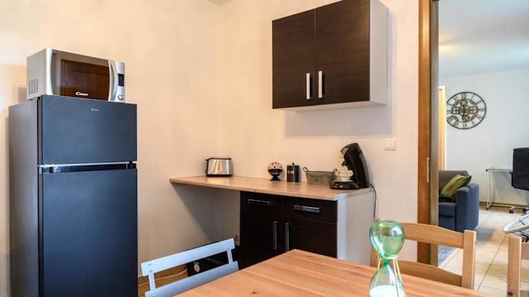Die Ferienwohnung besteht aus einem Schlafzimmer, einem Wohnzimmer und einer voll ausgestatteten Küche mit Kühlschrank und Kaffeemaschine. Zudem verfügt sie über ein Badezimmer mit Dusche und Haartrockner. Handtücher und Bettwäsche sind vorhanden. Die Unterkunft bietet Nichtraucherzimmer und einen Garten.