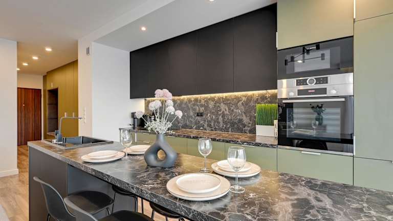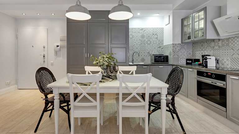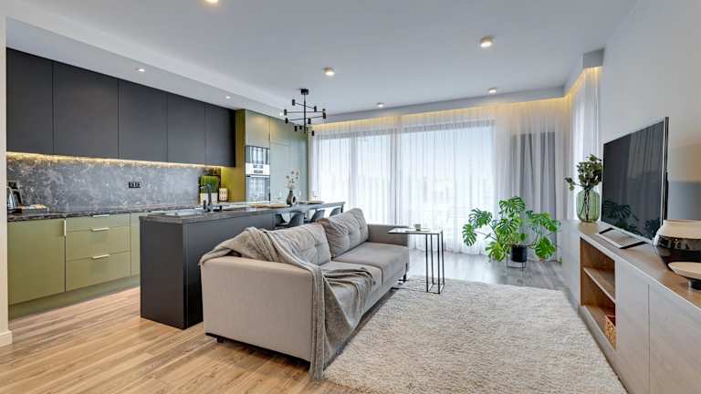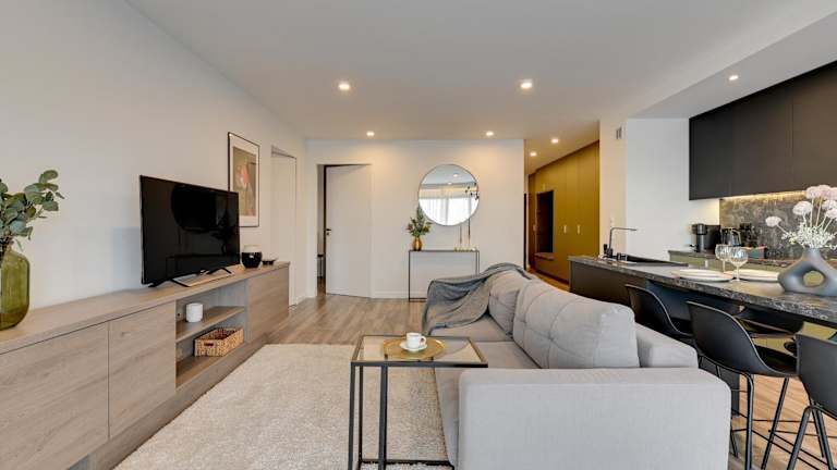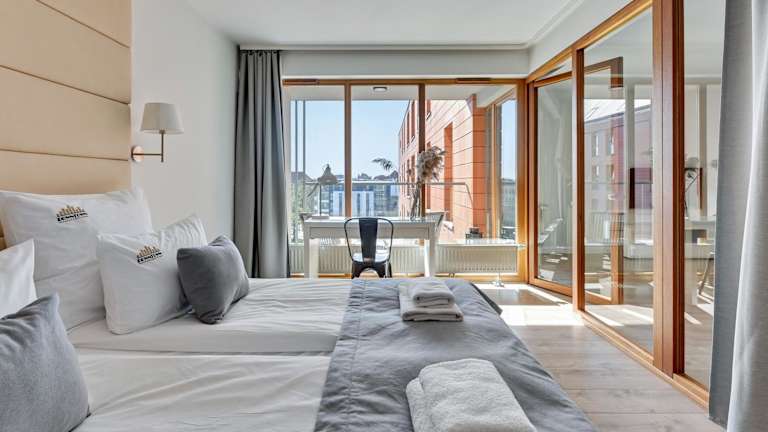 Die Apartments sind mit einer Küchenzeile ausgestattet, die einen Kühlschrank, Geschirrspüler und einen Ofen umfasst. Einige Wohneinheiten verfügen über eine Terrasse oder einen Balkon mit Blick auf die Stadt oder den Fluss.