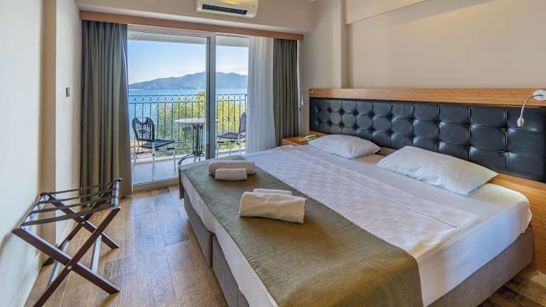 Die Zimmer sind mit Klimaanlage, Heizung, einem Balkon oder einer Terrasse ausgestattet und bieten einen Blick auf das Meer. Zur Ausstattung gehören ein Doppelbett, eine Kochnische mit Tee-/Kaffeekocher, eine Minibar und ein Safe. Ein TV sowie kostenloses WLAN sind ebenfalls vorhanden. Die Badezimmer sind mit einer Dusche und einem Haartrockner ausgestattet.