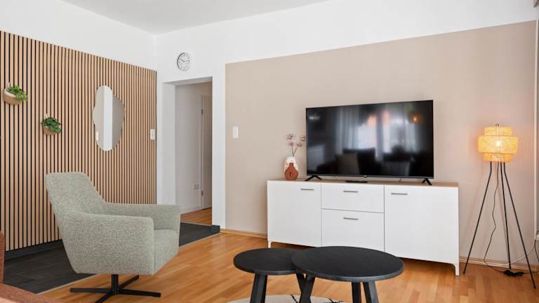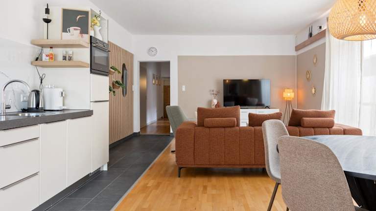 Die Ferienwohnung besteht aus zwei Schlafzimmern, einem Wohnzimmer sowie einer voll ausgestatteten Küche, die mit einem Kühlschrank und einer Kaffeemaschine ausgestattet ist. Zudem gibt es ein Badezimmer mit Dusche und Haartrockner. Handtücher und Bettwäsche werden bereitgestellt.