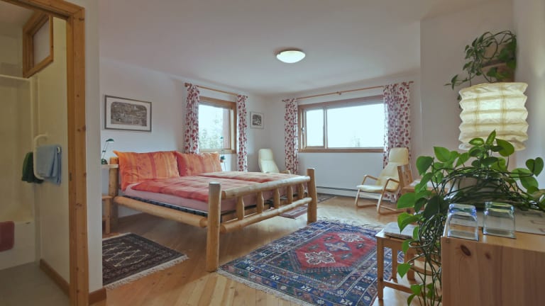 Wir offerieren: - fuenf unterschiedliche Zimmer in der Lodge, alle ausgelegt fuer zwei Personen mit Badezimmer, Fruehstueck und wunderschoener Aussicht. - zwei 1 1/2 Zimmer Ferienwohnungen im Cottage, ebenfalls fuer Einzel- oder Doppelbelegung, Kueche, Badezimmer mit Dusche, Veranda und Feuerstelle zum Grillieren. - eine 3 1/2 Zimmer Ferienwohnung fuer Familien bis zu fuenf Personen. Kueche, Badezimmer mit Dusche, 2 Schlafzimmer mit fuenf Einzelbetten, Veranda und Zugang zuer Feuerstelle.