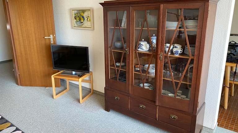 Die Ferienwohnung beinhaltet zwei Schlafzimmer, ein Wohnzimmer und eine gut eingerichtete Küche. Ausstattungselemente umfassen einen Kühlschrank, einen Geschirrspüler und einen Fernseher. Ein Balkon ist ebenfalls vorhanden.