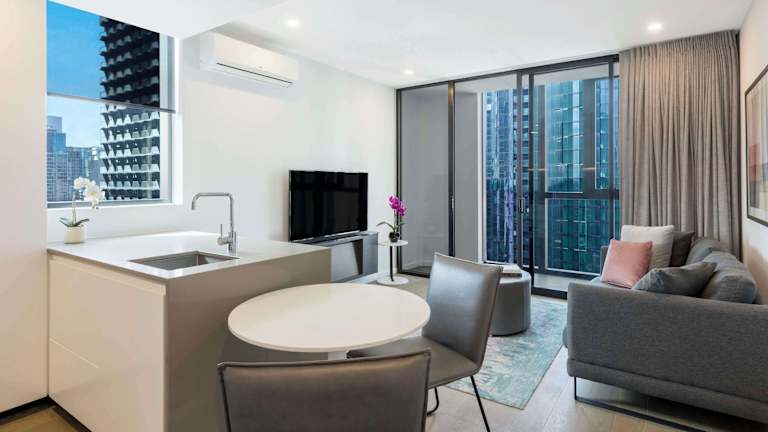 Die modernen Suiten der Avani Melbourne Central Residences bieten 1 oder 2 Schlafzimmer, eine voll ausgestattete Küche und Wäschemöglichkeiten. Entspannen Sie im geräumigen Wohnzimmer und genießen Sie den Blick auf Southbank, die Stadt oder die Queen Victoria Markets. Zur Ausstattung gehören auch ein Safe, eine Mikrowelle, ein Telefon und kostenpflichtiges WLAN.