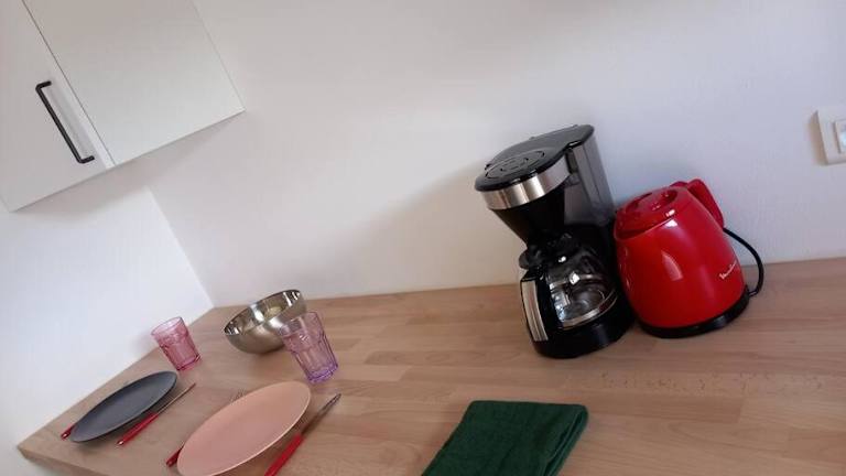 Die Ferienwohnung beinhaltet eine voll ausgestattete Küche mit Kühlschrank und Kaffeemaschine, was die Zubereitung eigener Mahlzeiten ermöglicht. Weitere Verpflegungsmöglichkeiten sind nicht angegeben.