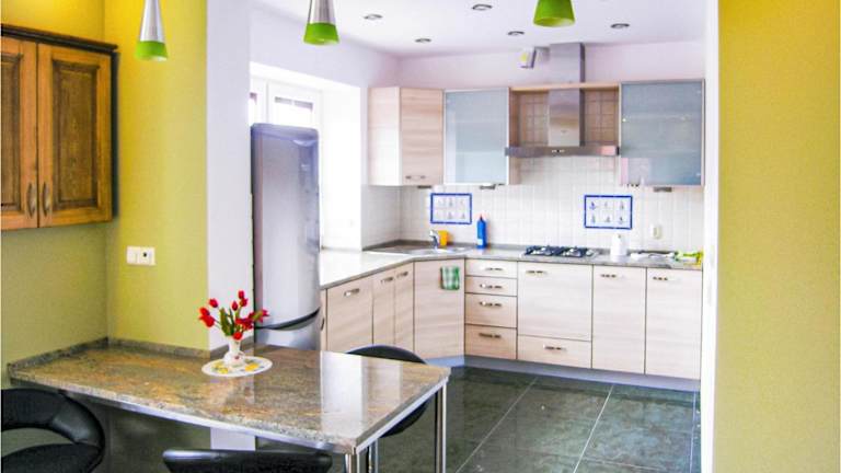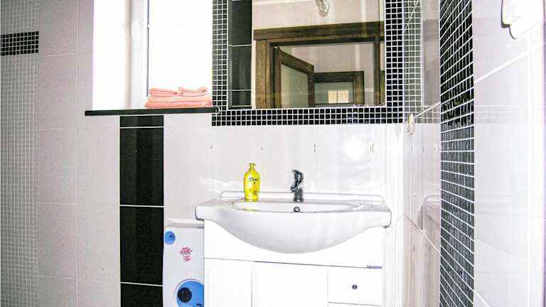 Das Ferienhaus umfasst zwei Schlafzimmer, ein Wohnzimmer, eine voll ausgestattete Küchenzeile mit Kühlschrank und Kaffeemaschine sowie zwei Badezimmer mit Dusche.