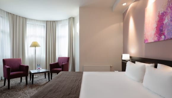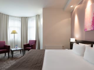 Gemütliche Zimmer von 22-27 qm mit einem Arbeitsplatz und einem TV ausgestattet. ROOM FACILITIES Großes Doppelbett/ 2 Einzelbetten* Kleiderschrank Sessel Bequemer Arbeitsbereich Klimatisierungssystem Kostenloses WLAN Sat-TV Telefon Minibar Tresor Schuhpflegeset Badzimmer mit Dusche Fön *1 Extrabett