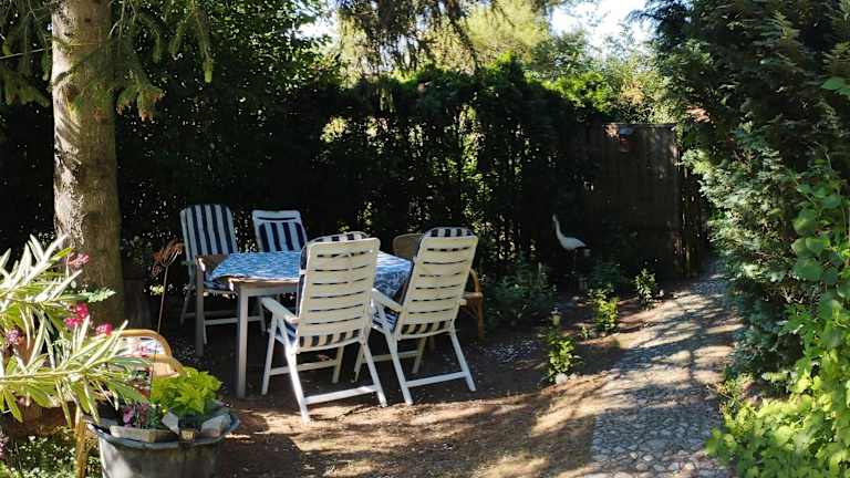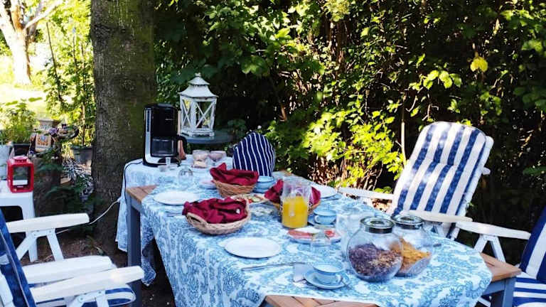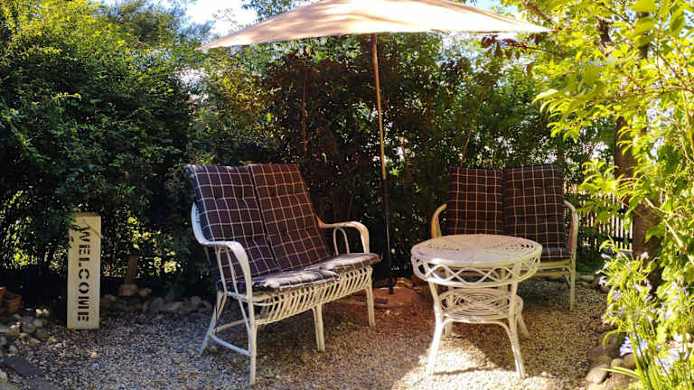 Die Ferienwohnung ist ausgestattet mit einem Schlafzimmer, einem Badezimmer, Bettwäsche, Handtüchern, einem Flachbild-TV mit Satellitenkanälen, einem Essbereich, einer voll ausgestatteten Küche und einer Terrasse mit Gartenblick.