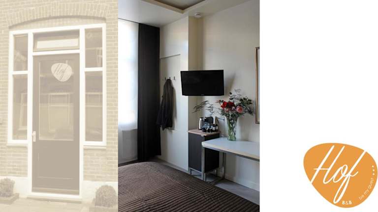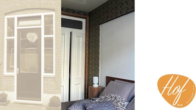 Das Zimmer im B&B Hof ist mit einem modernen Design ausgestattet. Es verfügt über Parkettboden, weiße Wände und eine graue Tapete mit goldfarbenen Blumen hinter dem Bett. Das private Badezimmer ist mit einer Dusche ausgestattet. Kostenloses WLAN und ein Flachbild-TV sorgen für Unterhaltung und Komfort während Ihres Aufenthalts.