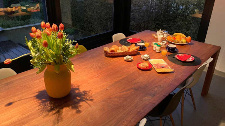 Starten Sie Ihren Tag im B&B Le Verger mit einem köstlichen Frühstück. Sie haben die Wahl, entweder im gemütlichen Speisesaal oder im modernen Wohnzimmer zu speisen, das mit deckenhohen Fenstern ausgestattet ist. Genießen Sie Ihre Mahlzeit in entspannter Atmosphäre und lassen Sie sich von den kulinarischen Köstlichkeiten verwöhnen.