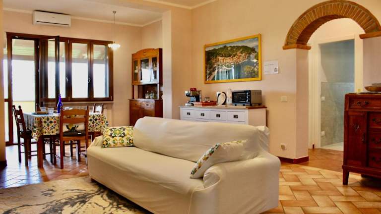 Die Ferienwohnung umfasst 1 Schlafzimmer, ein Wohnzimmer und eine voll ausgestattete Küche mit Kühlschrank und Kaffeemaschine. Es gibt auch ein Badezimmer mit Bidet und Dusche. Handtücher und Bettwäsche werden bereitgestellt und die Wohnung ist klimatisiert.