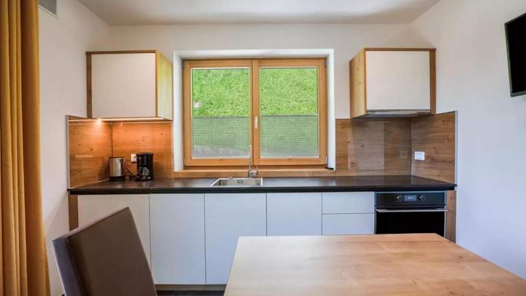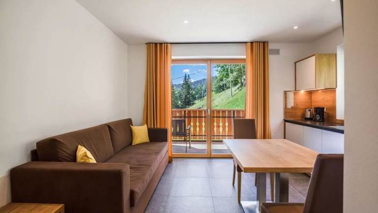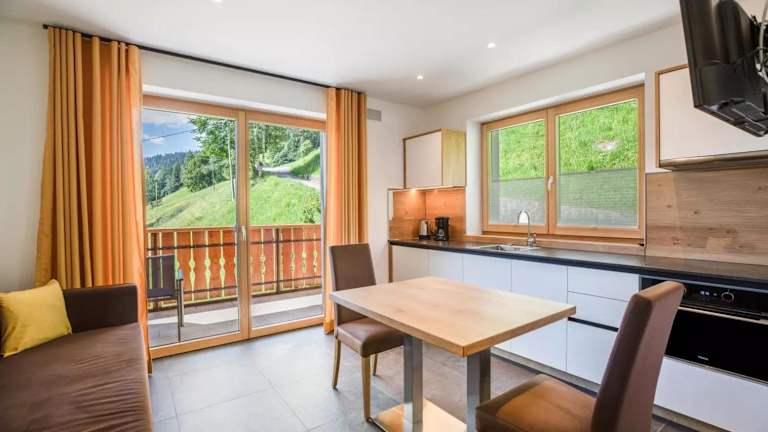 Die Ferienwohnung beinhaltet ein Schlafzimmer, ein Wohnzimmer, einen Fernseher, eine gut ausgestattete Küche mit Kühlschrank und Geschirrspüler sowie ein Badezimmer mit Dusche. Ein Balkon mit Bergblick ist ebenfalls vorhanden, und Handtücher sowie Bettwäsche werden bereitgestellt.