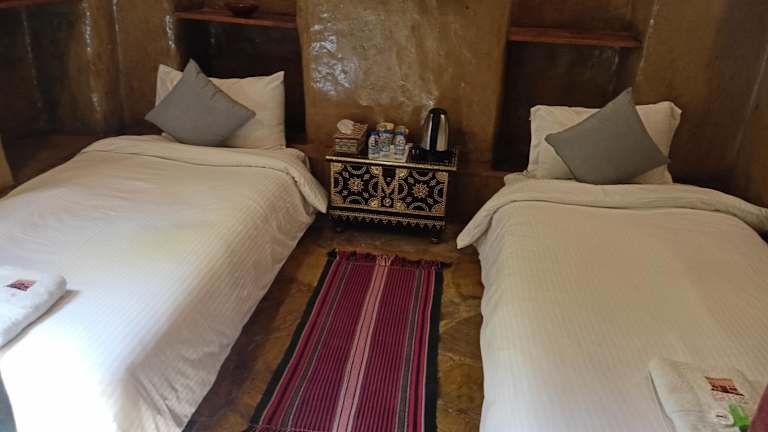 Die Zimmer im Bait Al Aqr Hotel sind klimatisiert und bieten einen komfortablen Rückzugsort für die Gäste. Jedes Zimmer verfügt über einen Schreibtisch und kostenfreies WLAN. Von der Terrasse aus können Sie den Blick auf die Berge und die Stadt genießen. Es gibt auch einen separaten Sitzbereich, der zum Entspannen einlädt.