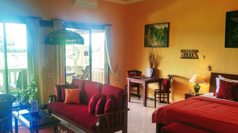 DE LUXE SUPERIOR ROOM - Ocean View (6 x 6 m) (20 x 20 FT) 36 qm (Total with Bathroom and Balcony = 79qm) 1 King Size Bed, A/C and Ceiling Fan, SAT-TV (intern.News, Sport- and Movie-Channel), In-Room Safe, Phone, WIRELESS Internet Access in Room, Roomservice, Minibar, Hairdryer, Bathrobe, Large Bathroom with Bathtub and seperate Shower, large Balcony with 2 Lawn Chairs and Dining Table, Teak Furniture troughout. FREE Wi-FI DE LUXE FAMILY ROOM - Ocean View (6 x 6 m) (20 x 20 FT) 36 qm (Total with Bathroom and Balcony = 79qm) 1 big room with 2 Queen Size Bed, A/C and Ceiling Fan, SAT-TV (intern.News, Sport- and Movie-Channel), In-Room Safe, Phone, WIRELESS Internet Access in Room, Roomservice, Minibar, Hairdryer, Bathrobe, Large Bathroom with Bathtub and seperate Shower, large Balcony with 2 Lawn Chairs and Dining Table, Teak Furniture throughout. FREE Wi-FI DE LUXE CLASSIC ROOM - Mountain View and Ricefield (6 x 5.5 m) (20 x 17 FT) 32 qm 1 King Size Bed, A/C and/or Fan, Roomservice, Phone, WIRELESS Internet Access in Room, Minibar, in-Room Safe, SAT-TV (intern.News, Sport- and Movie-Channel). Large Bathroom with Bathtub and seperate Shower, Teak Furniture throughout. FREE Wi-FI PRESIDENTIAL SUITE - Ocean and Mountain View: (7 x 10.5 m) (20 x 35 FT) 73,50 qm - Total with bathroom and huge Balcony 114 qm 1 King Size Bed, A/C and Ceiling Fan, SAT-TV (Indovision - 99 digital intern.channels like CNN, BBC, Star Movie, CineMax, Eurosport, Star Sport, ESPN, Discovery Channel etc.), DVD and CD Player, In-Room Safe, Roomservice, Phone, WIRELESS Internet Access in Room, Minibar, Hairdryer, Bathrobe, Large Bathroom with Bathtub and seperate Shower, large Balcony with 2 Lawn Chairs and Dining Table, Teak Furniture throughout. FREE Wi-FI
