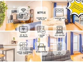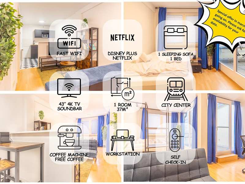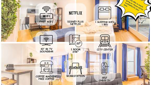 Die Ferienwohnung Balkon, 4k TV, Kaffee, Netflix verfügt über einen Balkon und bietet eine moderne Ausstattung. Kostenloses WLAN und ein Geldautomat stehen den Gästen zur Verfügung.