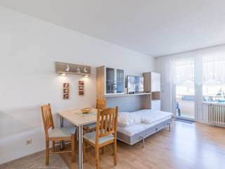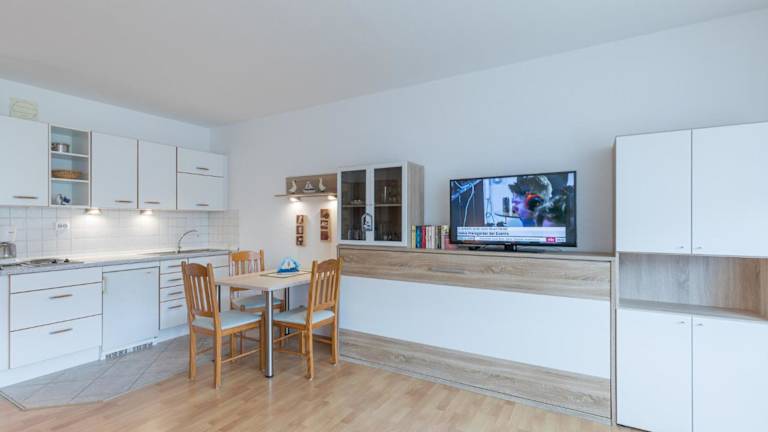 Die Ferienwohnung ist ausgestattet mit einem Wohnzimmer und einer voll ausgestatteten Küchenzeile, die über einen Kühlschrank und eine Mikrowelle verfügt. Für zusätzlichen Komfort können Handtücher und Bettwäsche gegen einen Aufpreis bereitgestellt werden.